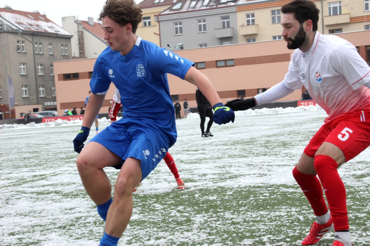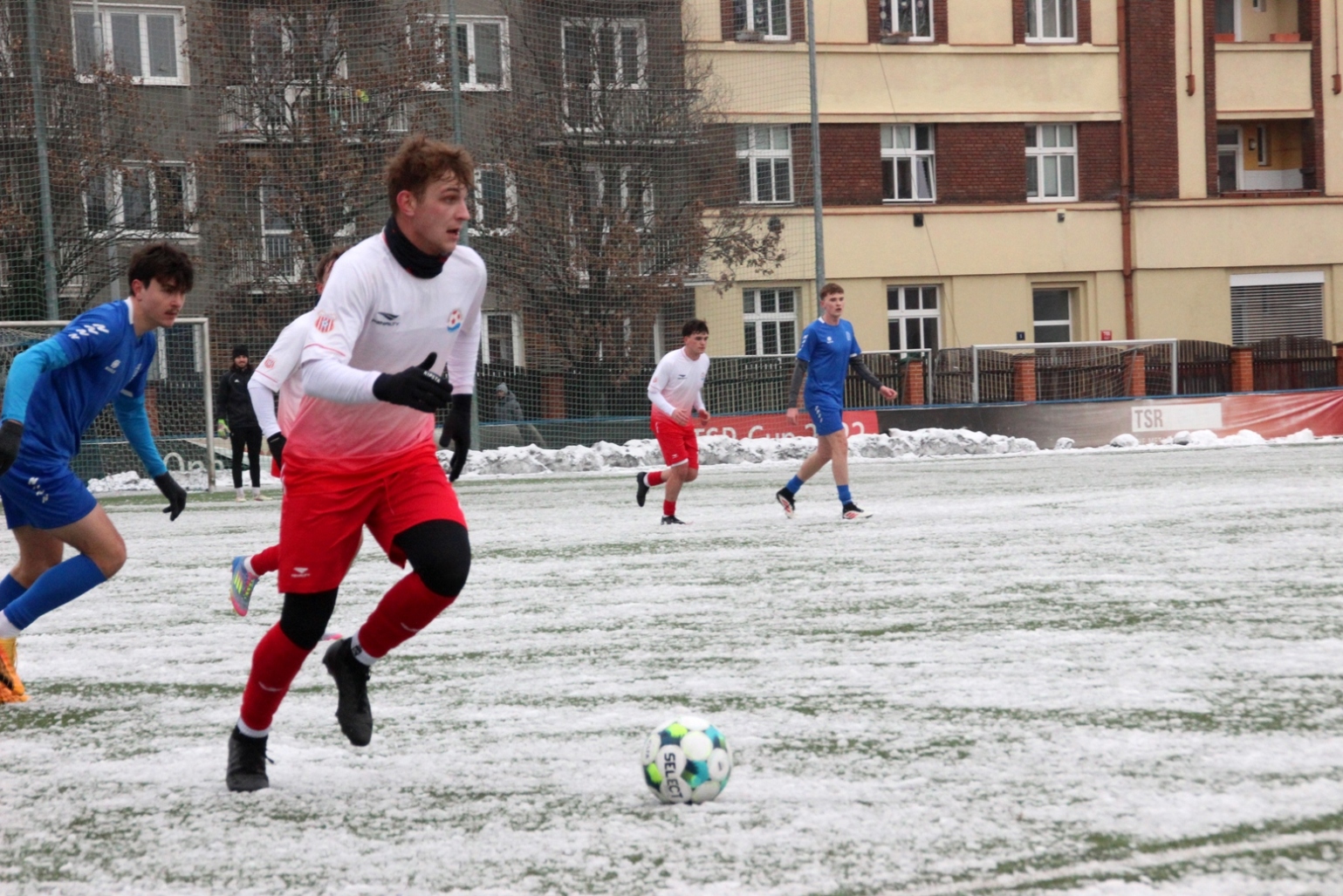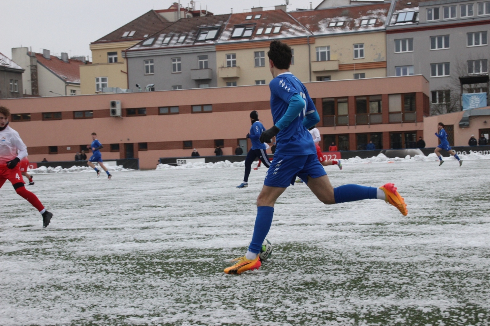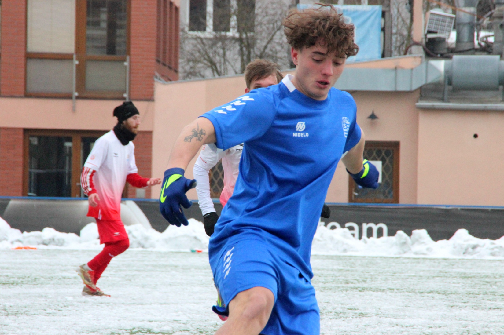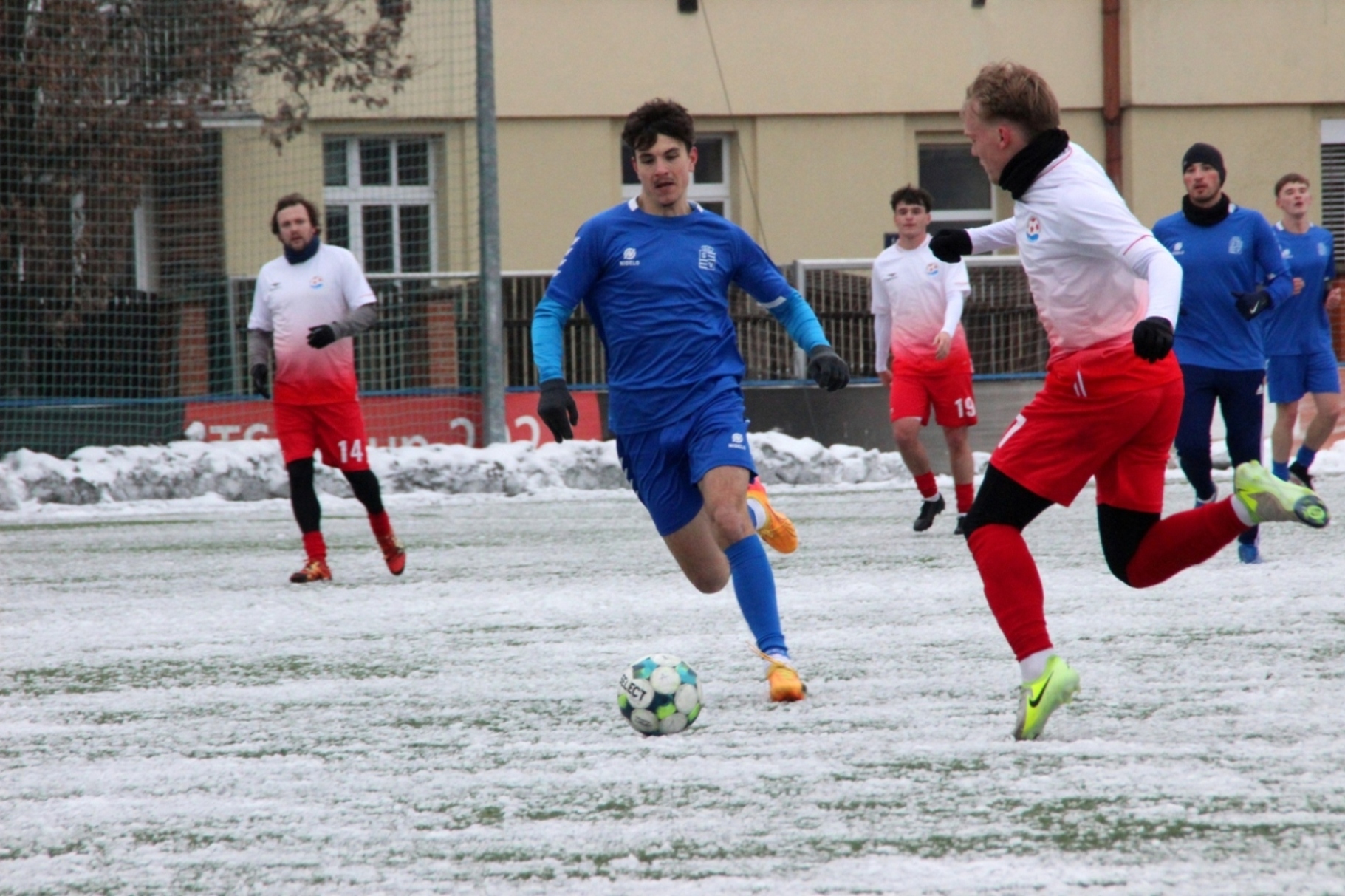 „A“-muži – Už v polovině prvního poločasu bylo hodně zřetelné, že třetí přípravné utkání v rámci zimní pauzy dovedou fotbalisté Slavoje Vyšehrad k vítěznému konci. Po 22 minutách hry totiž vedli nad Povltavskou 3:0, přičemž u všech tří branek, jež padly v rozmezí jedenácti minut, byl krajní záložník Matěj Prýmas (na snímku): první dvě dal sám a vzápětí, po faulu na něj v šestnáctce, proměnil penaltu Jiří Heřman. Až za tohoto stavu druhý tým podzimní tabulky divize A zvedl hlavu, vypracoval si šance, ale zmohl se jen na čestný úspěch po změně stran. Zápas na zmrzlém terénu tak skončil 3:1.