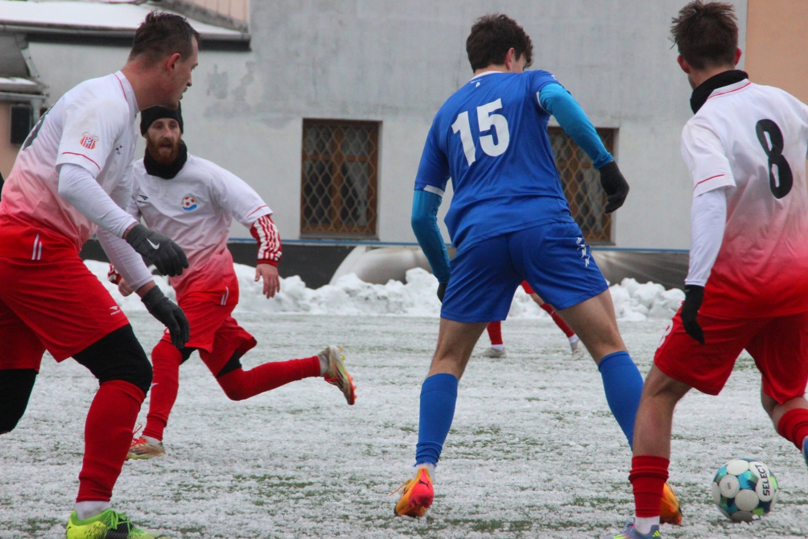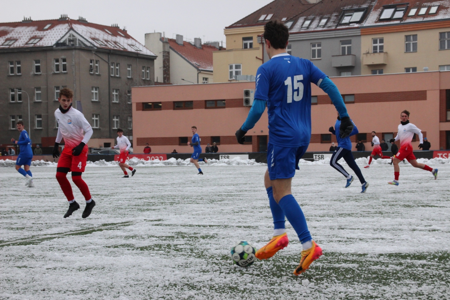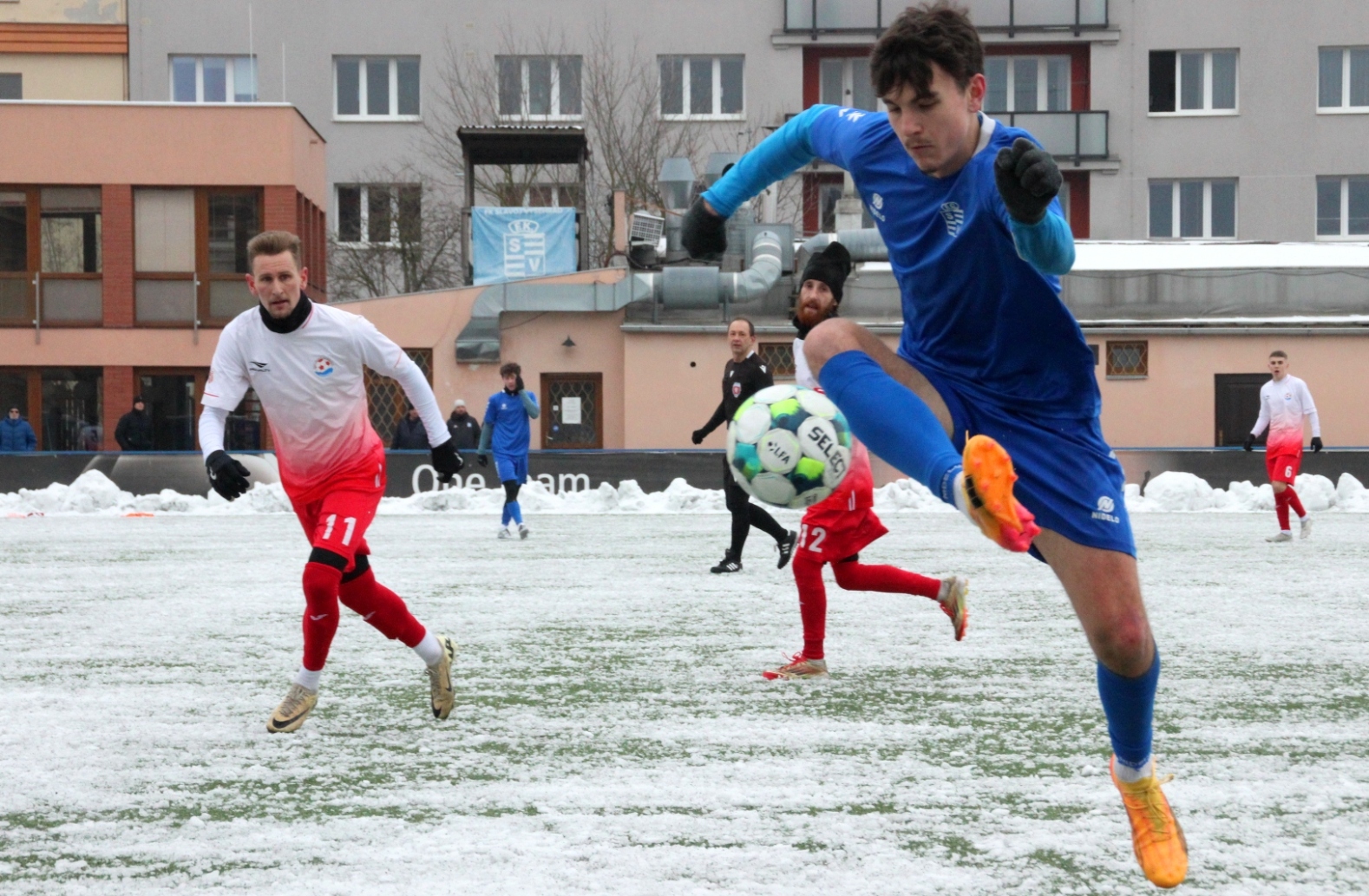 „A“-muži – Už v polovině prvního poločasu bylo hodně zřetelné, že třetí přípravné utkání v rámci zimní pauzy dovedou fotbalisté Slavoje Vyšehrad k vítěznému konci. Po 22 minutách hry totiž vedli nad Povltavskou 3:0, přičemž u všech tří branek, jež padly v rozmezí jedenácti minut, byl krajní záložník Matěj Prýmas (na snímku): první dvě dal sám a vzápětí, po faulu na něj v šestnáctce, proměnil penaltu Jiří Heřman. Až za tohoto stavu druhý tým podzimní tabulky divize A zvedl hlavu, vypracoval si šance, ale zmohl se jen na čestný úspěch po změně stran. Zápas na zmrzlém terénu tak skončil 3:1.